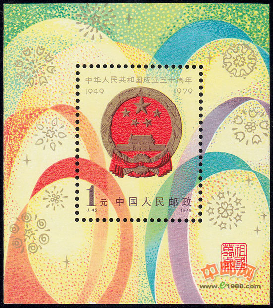1949年10月1日,北京30万群众齐集天安门广场,举行中华人民共和国开国典礼。中国邮电部于1979年为纪念中华人民共和国成立三十周年而发行,由卢天骄设计,北京邮票厂印制,志号J45。