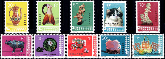 工艺美术取材广泛,从处处可见的一般材料如竹、草、木、布、泥、纸等,到珍贵或特殊的材料如象牙、玉石、金银等,门类繁多。最主要的有雕刻、编织、织绣、陶瓷、漆器。本套特种邮票选择了10件有代表性的工艺美术品。
