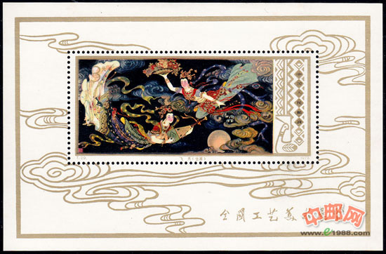 工艺美术(小型张)是随着T29邮票一起发行的。图案为“飞天(壁画)”。构图既有强烈动感,又显得稳重,均衡匀称。深蓝的背景与飞天鲜艳的服饰对比,更觉天空的深邃悠远,流动而富于变化的线条将飞天的姿态、衣袂之飞扬表现得淋漓尽致,纸边空白处悠悠的云彩使得神话气氛更浓。