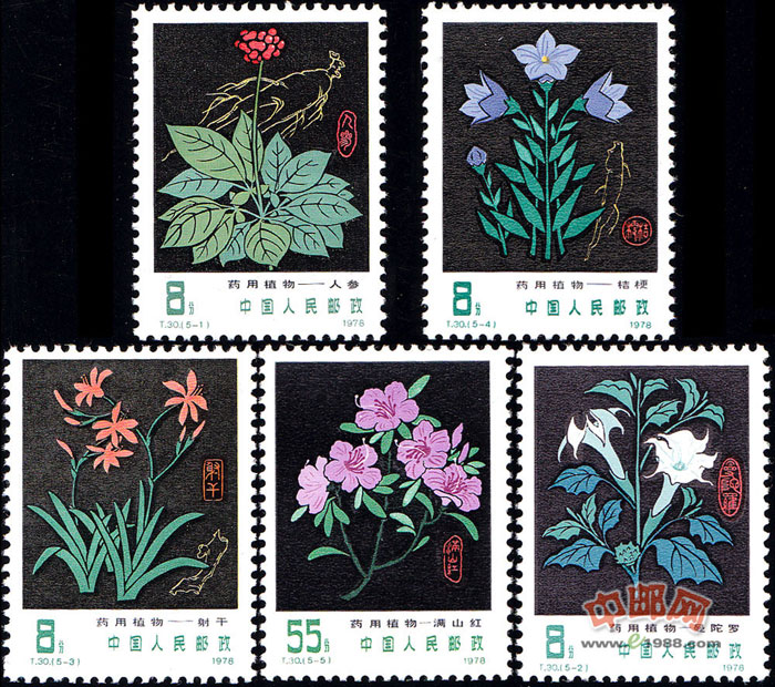 这套邮票上的五种植物是人参、曼陀罗、射干、桔梗、满山红, 均为中国人所熟知的药用植物。 分别介绍如下:
