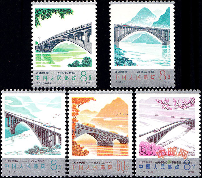 中国早在1700年前便建造了拱桥。拱桥承受压力的能力较好,可以用砖、石、混凝土和钢筋混凝土等抗压性能良好的材料来建造。大跨度的现代拱桥,也常用钢材建成。新中国成立后,改建、新建了数以万计的永久性桥梁,其中有许多是现代拱桥。这套邮票取材于中国1978年以前建成的五座公路拱桥,反映了富于中国特色的桥梁事业的迅速发展。