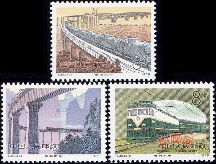 3-1为“电力机车”。画面为电力机车牵引一列绿色长龙驶入铁路隧道的壮观景象。邮票以绿色为基调。
