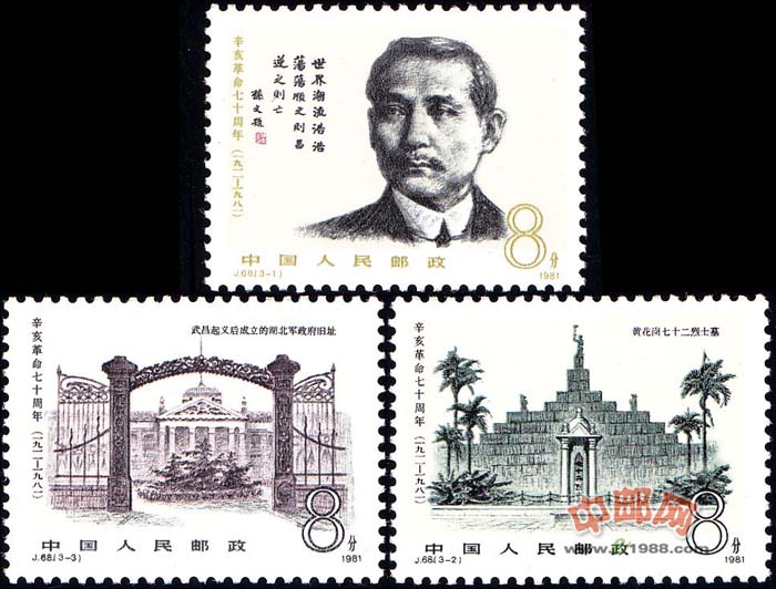 3-2为“黄花岗七十二烈士墓”。邮票在构图上、远近层次和空间关系上,作了精心的安排。广场上,巨大的花岗石砌成的陵墓气势磅礴,雄伟壮观,庄严肃穆,使人产生沉思悼念之情。墓两边高大的椰子树似卫士守护着陵墓。墓顶上的自由神,象征着革命烈士的大无畏的精神。