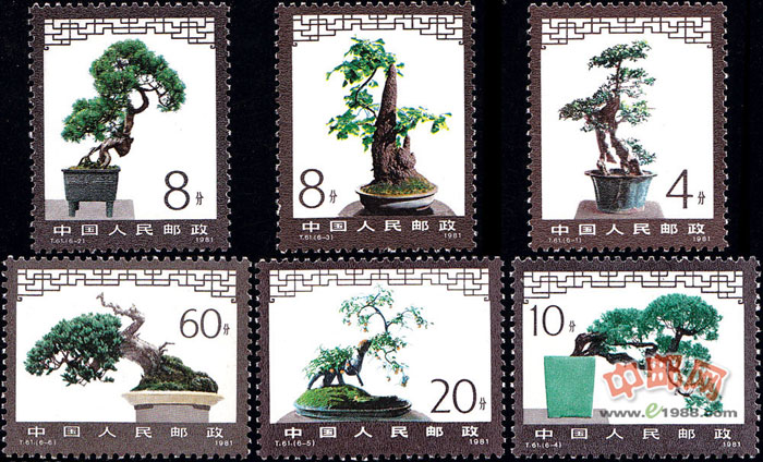此套盆景艺术邮票图案均取自树桩盆景,共6枚。