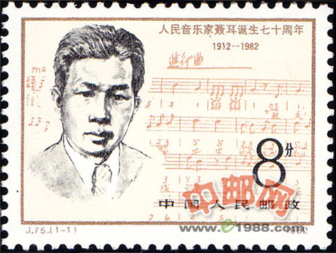 这套邮票共1枚,为“聂耳像”。左边是聂耳的肖像画,右边是一首乐曲。整个设计清晰淡雅,结构均称,精致大方,强烈地表现了邮票的主题。肖像画与曲谱有机地结合在一起,在布局上形成一个完美的整体。