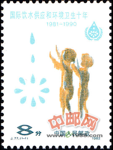 本套邮票共1枚,为“清水和儿童”。画面构图是对国际饮水供应和环境卫生十年活动标志的展示。在邮票的右上角保存了此标志:由十个蓝色水珠构成的大水滴及橄榄枝组成的图案。其中蓝色水珠代表洁净卫生的水;十个水珠代表十年计划,十个水珠构成一个大水滴又代表了积少成多,汇流成海;水滴的洒散象征十年活动向全世界所提供的服务;橄榄枝象征人类和平及联合国对十年活动的支持。邮票设计者一方面利用了标志,另一方面又设计了一对双手向上伸展的儿童,代表了人类对安全卫生饮水的渴望。
