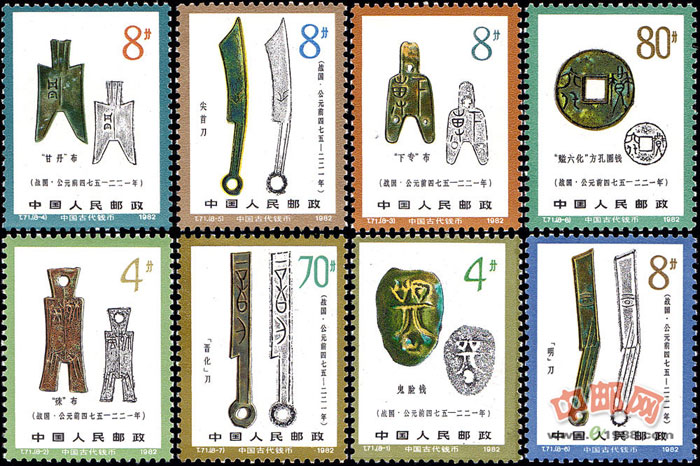 1982年2月12日发行了“中国古代钱币”特种邮票(第二组),选取的是战国时期的八种金属货币。