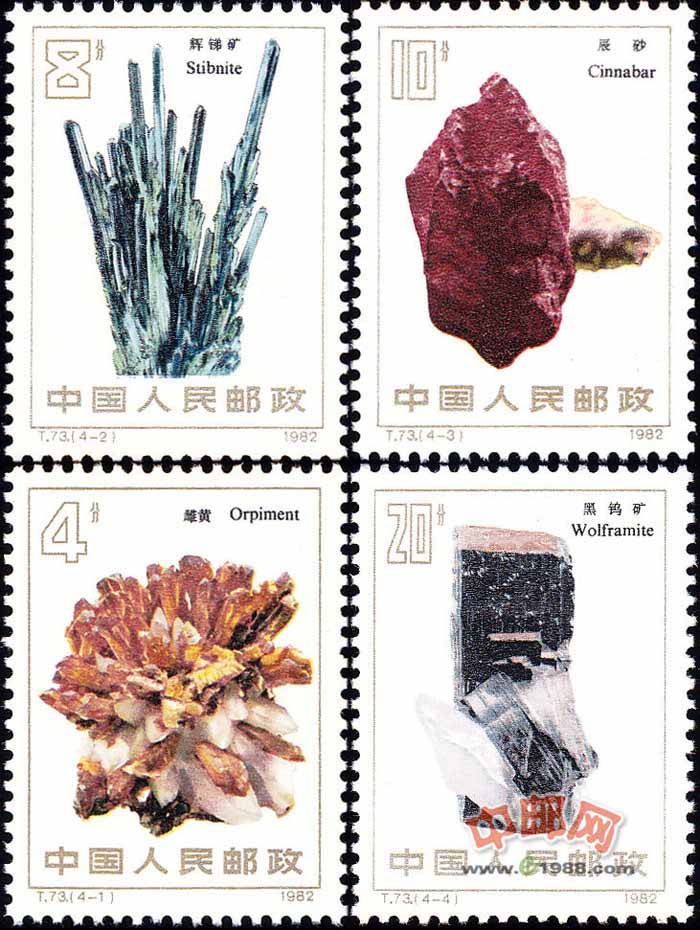 本套邮票于1982年8月25日发行,共有4枚。这4枚邮票分别以雌黄、辉锑矿、辰砂和黑钨矿为主题,这四种矿石是中国举世瞩目的矿产珍品。