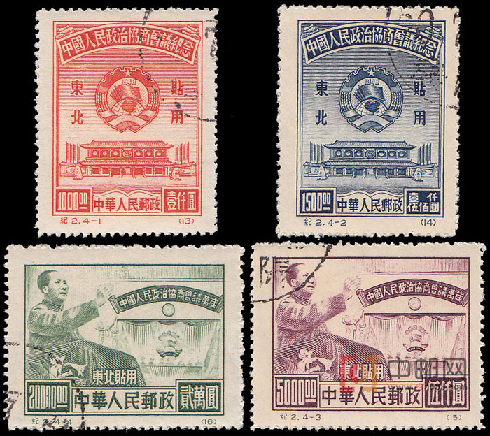 中国人民政治协商会议是中国人民爱国统一战线的组织,在中华人民共和国成立前夕,由中国共产党、各民主党派和无党派爱国人士、各人民团体共同创立。会议于1949年9月21日至30日在北平中南海怀仁堂举行。大会通过了作为临时宪法的《中国人民政治协商会议共同纲领》、《中国人民政治协商会议组织法》以及《中国人民政治协商会议第一届全体会议宣言》,会议选举了以毛泽东为首的中央人民政府,决定中华人民共和国定都北平,并将北平改名北京;决定五星红旗为中华人民共和国国旗,《义勇军进行曲》为代国歌;采用公元纪年。中国历史由此掀开了崭新的一页。本套邮票共4枚。4-1、4-2邮票的画面是新华门及中国人民政治协商会议会徽。新华门是中南海的正门。中华人民共和国成立后,中央人民政府和中国共产党中央委员会在这里办公,新华门亦成为中国政治权力的一个象征。
