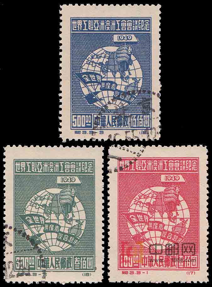世界工联为世界工会联合会的简称,它是一个进步的国际工人阶级的群众性组织。1949年11月16日至12月1日,在世界工联执行局领导下的亚洲澳洲工会会议在中国首都北京召开。为祝贺这次会议在刚刚诞生的新中国召开,华北邮政总局发行了这套纪念邮票。当时的全总副主席、亚澳工会会议筹备处负责人刘宁一,责成会议秘书处王润丰处长负责,他同《工人日报》的曹必慧密切合作,完成了此图稿。全套邮票3枚图案相同,均为宇宙间一颗硕大的地球,上绘亚洲、澳洲的版图,其中一只紧握上书“1949”字样铁锤的大手,从中国首都北京的位置上伸出。1955年1月10日发行再版票。
