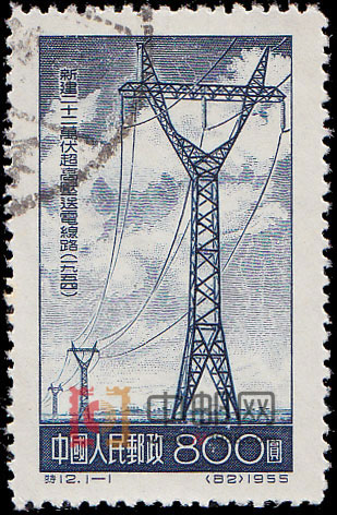 全国广大的城市、乡村和工业区,要得到政党电流,须有一个输电的过程,即将发电厂或变电所的电能,经变压器升压后,通过输电线路,送到远距离的亿万用户。1954年1月27日,我国第一条长达370公里的22万伏超高压送电线路,从东北北部到东北南部架设成功。全线共有10多主高的铁塔900多座,从而将松花江小丰满水电站充足的电力,源源不断地输送给东北南部的矿区和工业基地,有力地支援了国家的经济建设。邮票画面上即耸立在辽阔的东北大地上高大的输电铁塔。