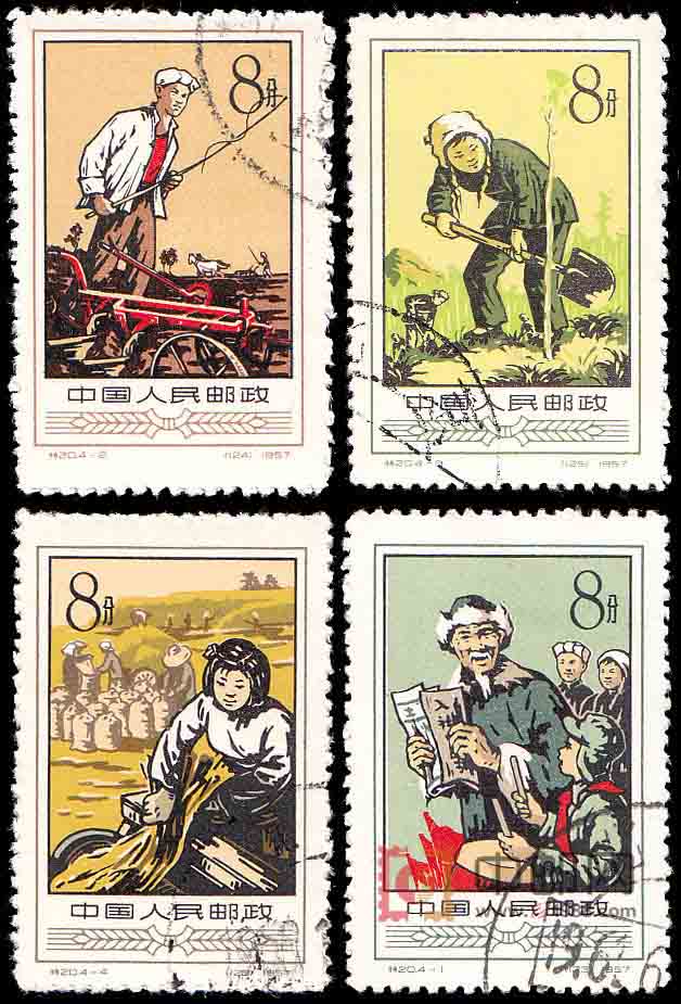 1951年9月9日,党中央召开了第一次农业互助合作会议,通过了《中共中央关于农业生产互助合作的决议(草案)》,《决议》要求各地按照“积极发展,稳步前进”的方针和“自愿互利,典型示范”的原则,逐步引导农民走上合作化道路。我国农业合作化运动仅用了4年时间就完成了这场深刻的社会变革,使5亿农民走上了社会主义道路,从而巩固了工农联盟,孤立了城乡资本主义,促进了手工业和资本主义工商业的社会主义改造,加速了农业和整个国民经济的发展。为此,邮电部发行了这套《农业合作化》特种邮票。
