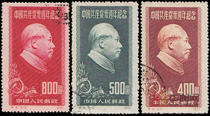 中国共产党是马克思列宁主义同中国工人运动相结合的产物。1921年7月23日至31日,中国共产党第一次全国代表大会在上海举行。从此,在中国出现了完全新式、以共产主义为目的、以马克思列宁主义为行动指南的、统一的工人阶级政党。1951年,中国共产党已经走完了30年的光辉历程。中国革命终于取得了全面胜利,建立了工人阶级领导的以工农联盟为基础的中华人民共和国。从这时起,中国开始走上了社会主义道路,在建党30周年之际,邮电部发行了这套纪念邮票。并于1955年1月10日再版。3幅画面,图案相同,均以毛主席像为主图。这是一幅毛泽东同志侧面头像的浮雕作品,为我国著名雕塑家张松鹤所创作。邮票画面左下角有橄榄枝和镰刀铁锤,以示对党的生日的祝贺。