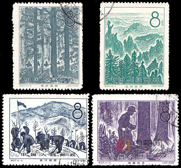 林业建设,在国民经济建设中占有重要地位。新中国成立以来,在植树造林、保护森林、开发林业产品、发挥防护作用等林业建设各方面,取得了很大成绩。1958年4月4日,国务院第74次会议,通过了中共中央和国务院关于在全国大规模造林的指示,以使农、林、牧、副、渔综合农业的全面发展,实现国民经济的大跃进。同年6月20日,又在北京召开了全国林业厅、局长会议,确定由1958年开始的第二个国民经济五年计划期间,全国造林18亿亩,仅1958年当年,就造林4亿多亩。为宣传建国以来我国林业建设的成绩,邮电部发行了这套特种邮票。4幅画而均采用我国著名画家黄永玉的木刻原画,并用雕刻版印制。