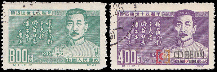 1936年10月19日,鲁迅因肺病,在上海与世长辞,享年56岁。巨星陨落一十五载。为了纪念他,邮电部发行了这套《鲁迅逝世十五周年》纪念邮票。全套2枚,画面相同,均为鲁迅半身画像及诗句:“横眉冷对千夫指,食道甘为孺子牛。”这两句话,源自1932年10月12日鲁迅写给著名爱国人士柳亚子先生的一首小诗,题为《自嘲》,全文:“运交华盖欲何求,未敢翻身已碰头。破帽遮颜过闹市,漏船载酒泛中流。横眉冷对千夫指,俯首甘为孺子牛。躲进小楼成一统,管他冬夏与春秋。”这首诗写在中国最为黑暗的年代,面对外部日本帝国主义的疯狂侵略和内部国民党反动派残酷压迫及文化“围剿”,鲁迅以幽然的笔调和自嘲的口吻,描述了自己深受迫害的险恶处境,抒发了顽强的斗志和乐观的豪情。这套邮票亦于1955年1月10日再版。