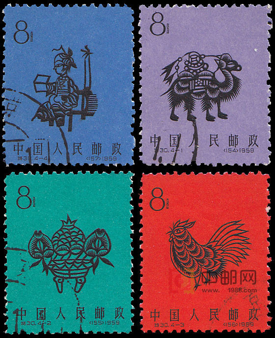 剪纸是我国人民喜闻乐见的一种民间艺术,现在发现最早的剪纸实物,是新疆吐鲁番高昌故址中出土的5幅1500年前北朝时期的团花剪纸。抗日战争时期,许多画家紧密结合抗战斗争,创作出不少富有生活气息的剪纸作品,深为根据地军民所喜爱。新中国成立后,随着城乡人民生活水平的提高,剪纸艺术更加得到了空前的发展和繁荣。为表现我国的剪纸艺术,邮电部发行了这套《剪纸》特种邮票,4幅图案均为我国著名画家,并担任过中央工艺美术学院院长的张仃教授,在抗日战争年代里创作并珍藏下来的陕北剪纸作品,乡土气息极浓,具有我国北方剪纸纯朴、浑厚、豪放、粗犷的鲜明特色。1图为骆驼,2图为石榴,3图为公鸡,4图为戏剧人物。