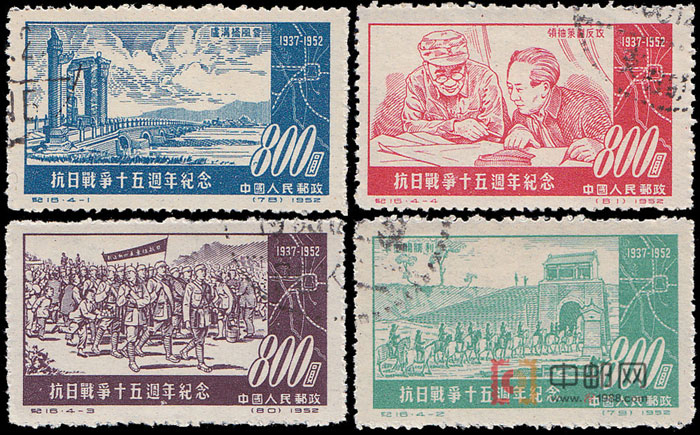 抗日战争是1937年至1945年中国人民在中国共产党领导下抗击日本帝国主义侵略所进行的一场伟大的民族革命战争。1937年7月7日日本侵略军向北平卢沟桥发动进攻,8月13日又在上海发动进攻,中国军队奋起抗战,形成全国抗战局面。1945年8月15日日本宣布无条件投降并于9月2日在投降书上签字。抗日战争是中国人民近百年来在反对帝国主义武装侵略的斗争中,第一次取得完全胜利的民族解放战争,是世界反法西斯战争的重要组成部分。1952年7月7日,正值“七·七”事变十五周年,邮电部发行了这套纪念邮票。以4幅画面,再现了这场伟大民族解放战争的光辉历史篇章。图案右侧,均绘有卢沟桥附近地理位置及交通略图,包括北京市及永定河的位置,还有京山、京汉、京包、京古等铁路线,使画面更富有历史感。