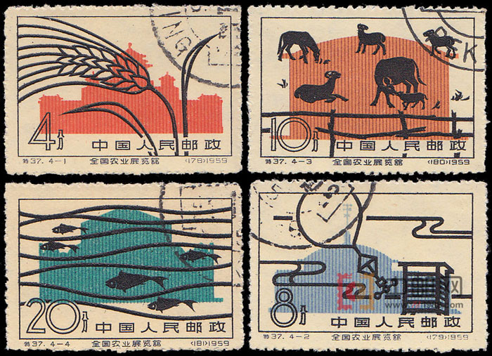 中华人民共和国成立后,广大农民在共产党和人民政府的领导下,走上了合作化的道路,为改变穷困落后投入了大量的劳动,十年来,为实现农业的现代化打下了一的物质基础,积累了经验。到第一个五年计划结束的1957年,生产条件改善,农、林、牧、副、渔得到了全面发展,农民的生活得到了改善。因此,为了展示新中国农业的丰硕成果,全国农业展览馆于1959年9月17日在北京建成,邮电部也为此发行了这套特种邮票。1图为综合馆,2图为气象馆,3图为畜牧馆,4图为水产馆。