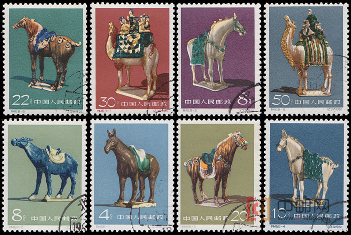 我国是瓷器的故乡,早在3000多年前的殷商时代,已经在陶器制造基础上,发明了原始瓷器。彩瓷起源于唐朝。唐三彩即是一种著名的彩瓷,其造型大致分为两类,一类是生活器皿,另一类是人俑和动物俑。据考证,唐三彩流行于唐高宗至唐玄宗时期,以开元、天宝年间为最盛。唐三彩的出现,为多彩陶瓷的出现开辟了道路,在我国陶瓷史上占有重要的地位。邮电部发行的这套《唐三彩》特种邮票。8幅画面均为三彩陶瓷中的精品,形态逼真传神,装饰华丽生动。