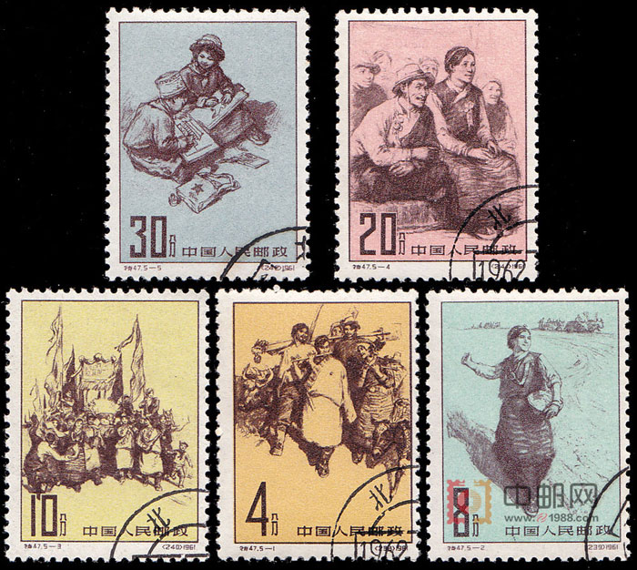 1959年3月10日,西藏地方政府和上层反动集团在西藏悍然改动武装叛乱。为维护祖国统一和民族团结,中国人民解放军驻藏部队奉命进行了平判。国务院于3月28日发布命令,解散西藏地方政府,成立西藏自治区筹备委员会,行使西藏地方政府职权,在广大藏族同胞和爱国的上层人士支持下,迅速地有步骤地在西藏实行了民主改革,彻底砸碎了封建农奴制的枷锁,使西藏人民从此获得了新生。为反映西藏民主改革的伟大胜利和西藏的新面貌,邮电部发行了这套《西藏人民的新生》特种邮票。5幅画面均取自组画《翻身曲》,系我国著名画家潘世勋创作。