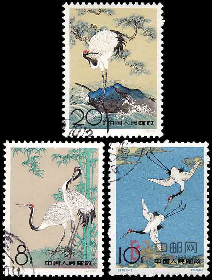 丹顶鹤,又称“仙鹤”,我国珍禽中的一种。我国驯养丹顶鹤,早在春秋时期就有养鹤的记载。丹顶鹤系列非常缓慢,因此,各国都把它列入濒危特种的“红皮书”。我国列为“一类保护鸟”。邮电部发行的这套《丹顶鹤》特种邮票,3幅画面均采用我国画家、工艺美术家和艺术教育家陈之佛创作的原画。他为庆祝建国10周年而创作的大型花鸟画《松龄鹤寿》,把十只松鹤画得栩栩如生,各尽其态,表现了画家的匠心独具和深邃意境。