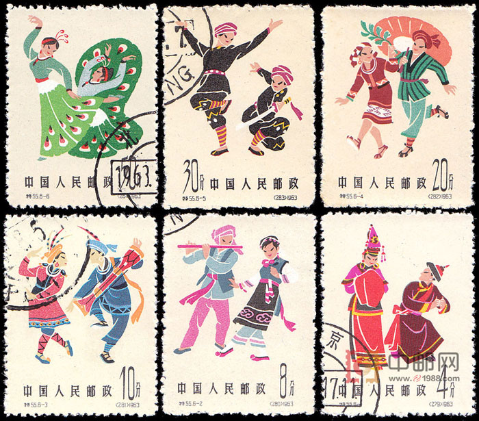 这套特种邮票,为《中国民间舞蹈》系列邮票的第三组,6幅画面均为我国画家倪常明创作的原画。第1图为畲族婚礼舞,描绘了一对新人正在对舞的场面。第2图为白族绕山林舞,描绘了白族绕山林舞的典型舞姿。第3图为瑶族长鼓舞姿。第4图为黎族三月三舞,画面为一对黎族青年恋人手执桂叶,肩擎遮阳伞,奔波追逐的热情景。第5图为佧佤族刀舞,画面上的刀舞刻划了佧佤人民的不屈形象。第6图为傣族孔雀舞,描绘孔雀开屏时的舞姿。