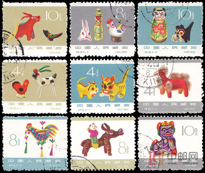 民间玩具是工世美术制品。它具有美的观赏价值,使人赏心悦目;又具有实用性,通过玩耍有利于启发少年儿童的想象力和创造性,开拓他们的智力和视野。这套邮票所选取的民间玩具,其实物和资料均由李寸松和张仃两人提供,它们多以泥土、布头为材料,以动物和人物为对象,运用丰富的想象,适当的夸张变形,细腻的手法和创造力,从儿童那纯洁无邪的心理特征出发,精心制作而成。这些形象既朴实,又活泼,憨态可掬,充满了天真和稚气的民间玩具,不仅成为少年儿童的亲密伙伴,也为广大群众所喜爱。