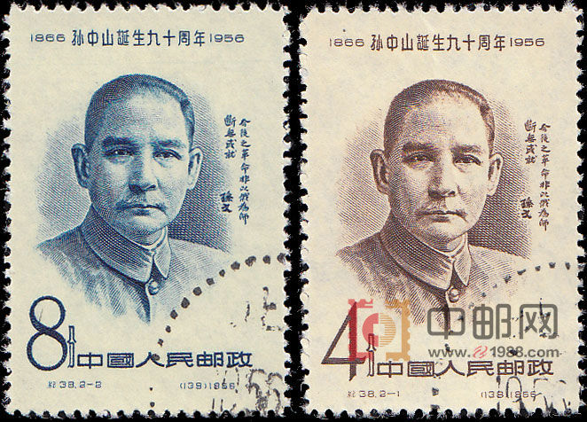 孙中山,名文,字德明,号逸仙,曾用化名中山樵,因此又号中山。1866年11月12日(清同治五年十月初六日)出生在广东香山(今中山)县翠亨村。1925年3月12日在北京逝世,终年60岁。为纪念这位“全心全意地为了改造中国而耗费了毕生精力”的我国资产阶级民主革命的先行者,伟大的民主主义革命家,中华民国的创始人,在他诞生90周年之际,邮电部发行了这套纪念邮票。二幅画,均为孙中山的正面像以及“今后之革命,非以俄为师,断无成就”的题词手迹组成。