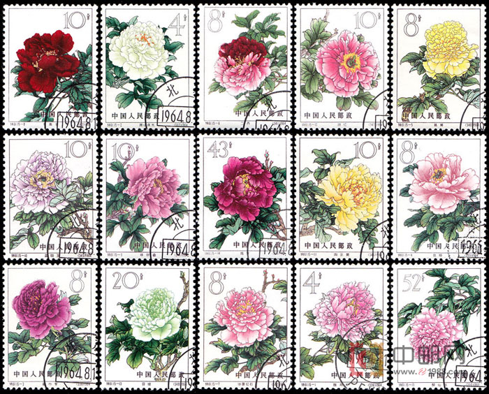为展示我国牡丹芳容,邮电部发行了这套《牡丹》特种邮票。16幅画面中的17个牡丹品种,均是牡丹中的典型,采用我国著名花鸟画家田世光创作的原画进行设计。1-15图分别为[胜丹炉],[昆山夜光],[葛巾紫],[赵粉],[姚黄],[二乔],[冰罩红石],[墨撒金],[朱砂紫],[蓝田玉],[御衣黄],[胡红],[豆绿],[魏紫],[醉仙桃],小型张为[状元红、大金粉]。