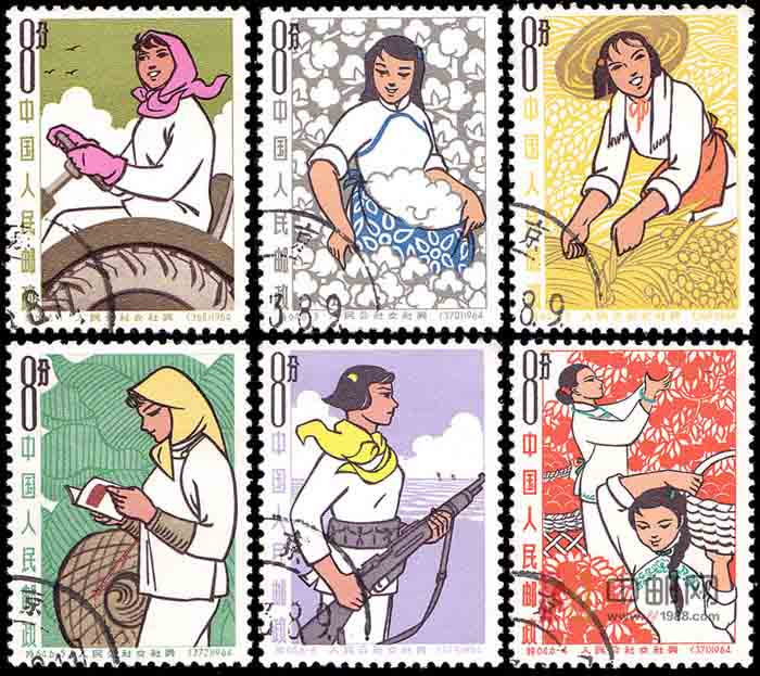 1958年9月10日,我国公布《关于在农村建立人民公社问题的决议》后,到10月底,全国74万多个农业生产合作社改组为2.6万多个人民公社,参加公社的农户占总农户的99%以上,8亿农民走上了人民公社化的道路。为宣传人民公社中广大女社员的作用,在1964年“三·八”国际劳动节之日,邮电部特发行了这套《人民公社女社员》邮票。