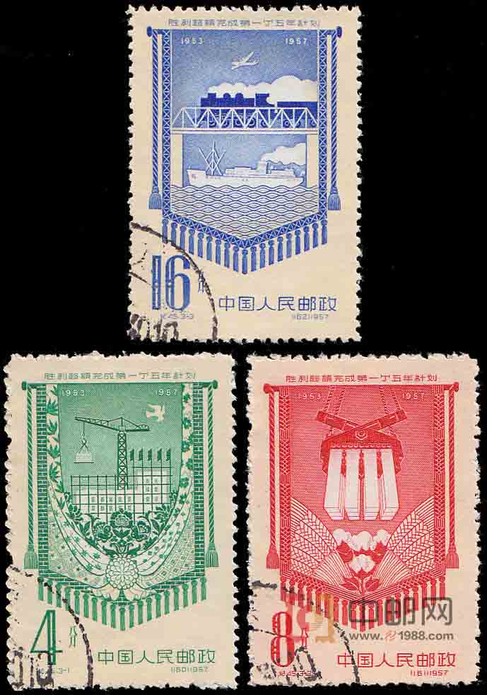 我国从1953年到1957年发展国民经济的第一个五年计划,是实现社会主义建设总路线的重大步骤,它标志着我国大规模有计划的社会主义建设的开始。为了实现第一个五年计划,党和国家采取了一系列的重大措施:抓住重点建设,发挥现有企业的潜力,统一调配和培养建设干部,增产节约,积累资金,开展先进生产者运动,调动了方方面面的积极因素,投身到社会主义建设事业中。在全党和全国人民的共同努力下,“一五”计划的大多指标,到1956年就已提前一年基本完成。1957年底,全面超额完成了“一五”计划,社会主义经济建设取得了巨大成就,使我国已初步建立了社会主义工业化的基础。为祝贺“一五”计划的胜利超额完成,邮电部发行了这套纪念邮票。3幅画面均以一面锦旗和图案,上面绘有不同行业的建设成就,既显示了劳动者的创造力,也是对他们的褒奖和鼓励。