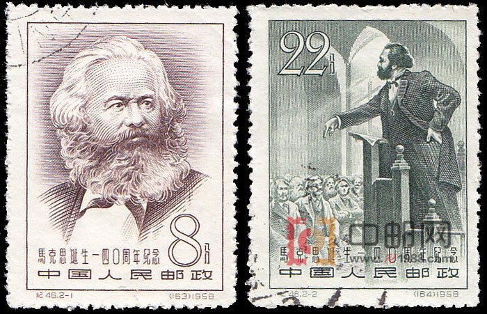 在欧洲1848年至1849年革命期间,马克思和恩格斯一起回到德国,亲自参加并领导了人民群众的革命斗争。革命失败后,被逐出普鲁士,先到巴黎,后定居伦敦。在伦敦,他积极组织工人进行革命斗争,并致力于革命经验的总结和经济理论的研究。在马克思诞生140周年之际,邮电部发行了这套纪念邮票。2幅画面均依据苏联著名版画家尼·尼·茹可夫创作的马克思画像而进行设计的,反映了马克思在这一时期的斗争生活。