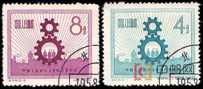1957年12月2日至12日,中国工会第八次全国代表大会在北京举行。出席这次大会的正式代表989名,候补代表100名,还有30多个国家和地区的工会代表团。党和国家对这次会议极为重视,毛泽东、刘少奇、周恩来、朱德出席了大会。这次大会是在指头右倾保守和要求各项事业加快发展的思想指导下召开的。为祝贺这次大会的召开,邮电部发行了这套邮票。2幅画面图案相同,描绘了大、小两个齿轮,巧妙地组成一个“8”字,表达了全国工人阶级在工会“八大”精神指引下,朝气蓬勃的发展景象。