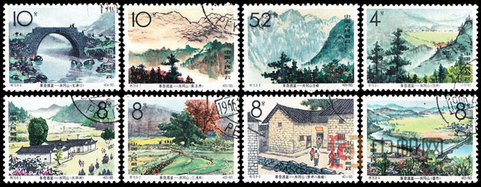 井冈山位于罗霄山脉中段,迤逶连绵800余里,山势险要,粮食、特产丰富,具有开展革命斗争的有利条件。井冈山的斗争为中国革命开辟了一条以农村包围城市,最后夺取城市的正确道路,它的光辉业绩将永载人民革命斗争史册。为此,在中国共产党成立44周年之际。邮电部发行了这套特种邮票。图1-8分别为茨坪、三湾村、茅坪八角楼、砻市、大井村、龙源口、黄洋界、井冈山主峰。