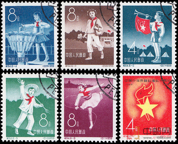 中国少年先锋队,简称“少先队”。其性质是中国少年儿童的群众组织,是学习共产主义的学校,是中国共产党委托中国共产主义青年团进行领导的组织。1959年10月13日,为庆祝中国少年先锋队建队十周年,首都的少先队员在人民大会堂举行了隆重的纪念大会。为此,邮电部于同年11月10日发行了这套邮票,以示对中国少年先锋队建队10周年的纪念。6幅画面分别反映了我国少先队员在德、智、体各方面茁壮成长的情况。