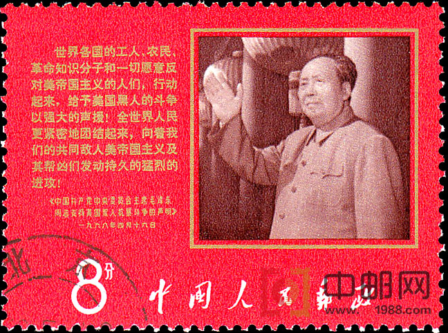 本套邮票共1枚。邮票图案是毛泽东像和《声明》摘录。毛泽东站在天安门城楼上,向群众挥手致意。他身穿银灰色的呢制中山装,身姿魁梧挺拔,脸上神采照人,目光深邃而锐利,充满了自信和洞察力,嘴角微徽带着安祥宁静的笑意,挥动的大手坚定有力、从容稳健。画面突出了他的领袖气质和魅力。总之,这是一幅照得十分成功的领袖像。