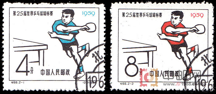 1959年于西德多特蒙德举行的第25届世乒赛上,我国年轻选手容国团先后战胜美国的迈尔斯、日本的荻村、匈牙利的西多等一些闻名世界的强手,一举夺得男子单打“圣·勃莱德”冠军杯,为中国在世界体育大赛上首摘桂冠,为中华民族争得了荣誉,从而结束了世界冠军榜上无名的历史。为纪念25届世乒赛上我国夺取男单冠军的历史性突破,邮电部发行了这套邮票,图案为容国团挥拍抽球的英姿。