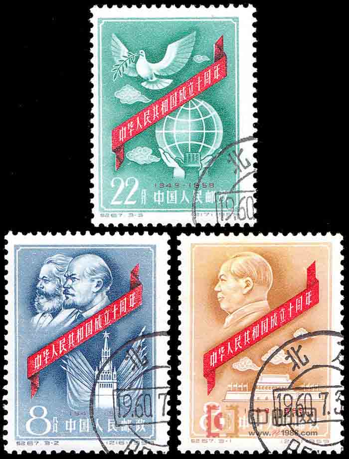 3-3为“世界和平万岁”。主图为衔着橄榄枝的和平鸽,三种不同肤色的手托着地球和“中华人民共和国成立十周年”绶带,还有几朵祥云作衬托。