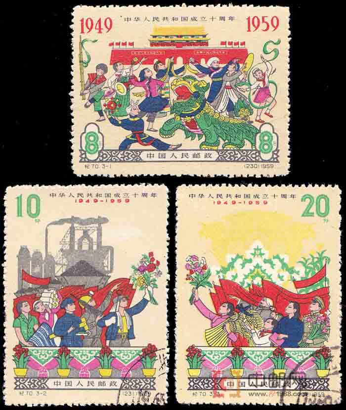图案面值:1 举国欢庆 8 分 250 万枚 2 举国欢庆 10分 未知 3 举国欢庆 20分 未知 邮票介绍:这套建国10周年系列邮票第四组,在3幅邮票画面的设计上,运用了民族传统艺术形式,以渲染喜庆的气氛。第1图描绘全国各族人民在天安门广场上载歌载舞、热烈欢庆的场面,第2图描绘了一队工人手持鲜花和工业产品热烈欢庆的场面,第3图农民和解放军战士、知识分子和少先队员手持鲜花和农产品热烈欢庆的场面。