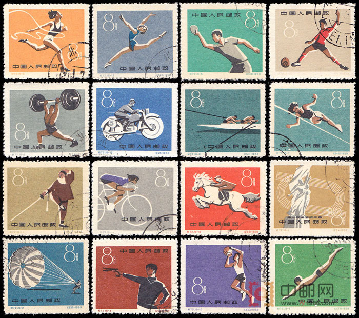 邮票介绍: 为检阅建国十年来体育运动的成就,进一步促进和推动全民体育活动的开展,中华人民共和国第一届运动会在北京举行。全国各省、市、自治区和中国人民解放军共29个单位的10658名男女运动员参加,其中在北京参赛的有7707人。本届全运会展示了新中国短短十年来体育事业的巨大成就,不仅令全世界刮目相看,也使全国各族人民深受鼓舞。为此,邮电部发行了这套邮票,以16幅画面纪念第一届全国运动会的圆满召开和胜利结束。
