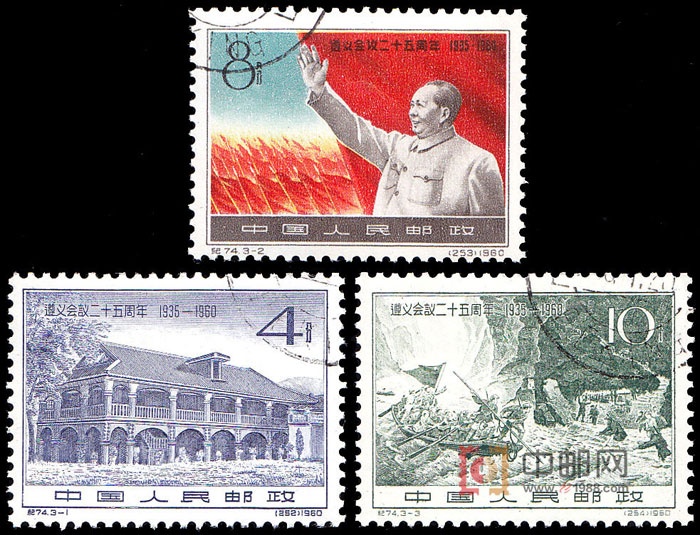 1935年1月15日至17日,中共中央政治局在贵州遵义召开扩大会议。会议集中全力纠正了当时具有决定意义的军事上的错误,重新肯定了毛泽东等在多次反“围剿”中所采用的战略战术的基本原则,明确指出第五次反“围剿”的失败及退出苏区后遭到的严重损失,其主要原因是博古和李德在军事指挥上违背了这一系列基本原则。遵义会议是中国共产党历史上第一次独立自主地运用马列主义基本原理,解决自己的路线、方针和政策的会议,在中国革命极端危险的时刻挽救了党和红军,是党的历史上的一个生死攸关的转折点,为中国革命开辟了走向胜利的航道。为此,在遵义会议25周年之际,邮电部发行了这套邮票,以资纪念。