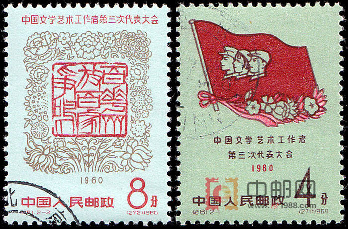 邮票介绍: 第三次全国文代会于1960年7月22日至8月13日在京召开。这次文代会是中国文艺界的一个里程碑,根据会议研究讨论和总结部署的问题和工作,1961年中宣部形成了《关于当前文学艺术工作的意见》(草案)、即《文艺十条》,次年修改成《文艺八条》,在文艺界执行。为祝贺第三次全国文代会的召开,在会议期间,邮电部发行了这套邮票。共2幅画面。