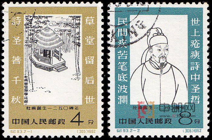 我国唐代伟大的现实主义诗人杜甫,以其忧国忧民的崇高精神境界和推己及人的宽广博大胸怀,而为世人怀念和尊敬。1962年,杜甫诞生1250周年,世界和平理事会把它列为世界文化名人。首都北京文艺界于4月17日举行了纪念大会,冯至先生在大会上作了题为《纪念伟大的诗人杜甫》的专题报告。邮电部于5月25日发行了这套纪念邮票。以2幅画面及画面上的2幅对联,概括描述了杜甫的一生,以示对伟大诗人的缅怀和纪念。