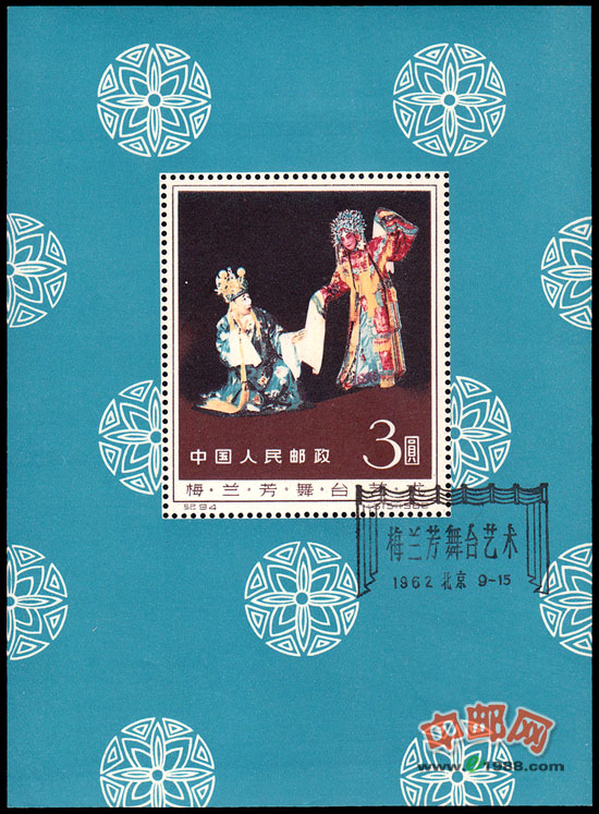 1965年9月15日发行,由吴建坤设计,面值3元,采用的是剧照《贵妃醉酒》。梅兰芳在此戏中,把两只水袖抖拂得大方自如,不仅表现了杨贵妃雍容华贵, 连长吁短叹、自怨自艾也在水袖上流露无遗,表现出高超的技艺,小型张仅发行2万枚。梅兰芳的精湛表演艺术和邮票传神的设计,加之存世量甚少,使梅兰芳舞台艺术邮票和小型张身份百倍, 成为广大邮迷追寻的珍邮之一。