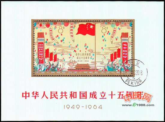 为庆祝建国15年来我国在各方面所取得的辉煌胜利,邮电部发行了这套纪念邮票,编号纪106,全套3枚横联印,分别为“中国共产党万岁”、“庆祝中华人民共和国成立十五周年”、“毛主席万岁”。邮票图案中各族人民聚集在北京天安门广场,热烈庆祝国庆佳节。邮票以横三联形式出现,构成一整体,以绚丽多彩的画面,表现出中国人民举国欢腾、热烈庆祝中华人民共和国成立15周年的场面。
