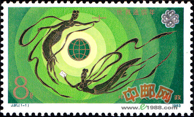 本套邮票共1枚,为“飞天”。图案是两位飞天女神绕地球飞翔,一位手持信件,一位手托卫星,象征着中国通信事业的发展;背景的光环表示电波,象征着安全、畅通的通信事业。右上角是法国人门德设计的世界通信年徽志。图案中回转交错的线条,象征四通八达的公路和纵横交错的电路,表明邮电通信遍布世界各地,通达五洲四海。此外,线条在东南西北4个方向上绞合成四颗心形图案,表明世界各国人民互通信息,心心相印。
