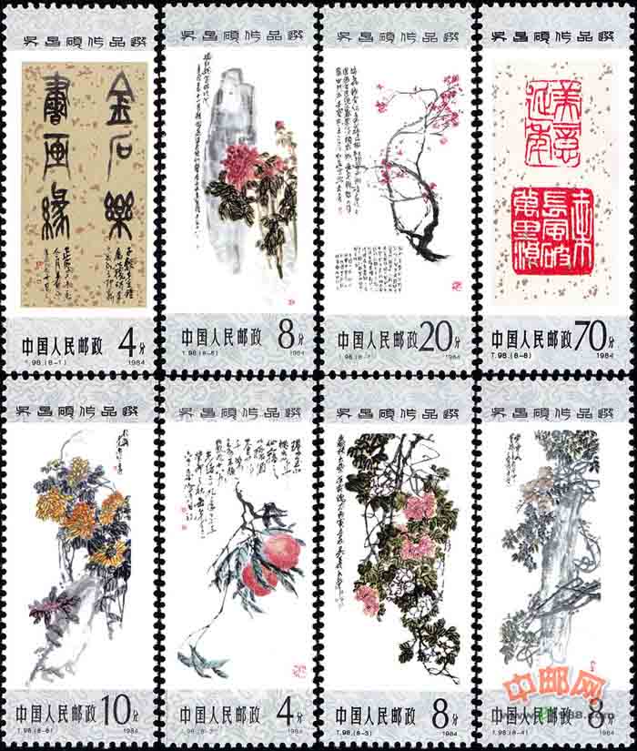 “吴昌硕作品选”特种邮票,编号T98,1984年8月27日发行。全套8枚,安排书法、篆刻各1枚,绘画6枚。这8幅作品大都为70岁以后的作品,充分反映了他在书、画、篆刻方面的艺术造诣。邮票设计采用“一色装”装裱形式,天、地头以银色花绫装饰,突出了画芯的作品,很有立轴的古朴感。