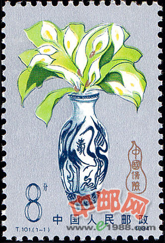 本套邮票共1枚。画面呈现的是一只白地蓝花的大花瓷瓶,瓶中插着一束绿叶衬托的白马蹄莲花,给人一种清淡、明快的感觉。瓷瓶上画着一只只婷婷玉立的大小仙鹤,聚集在一个篆体“寿”字周围引颈长鸣;马蹄莲花中有几只若隐若现的手臂,以金币投向瓶口。