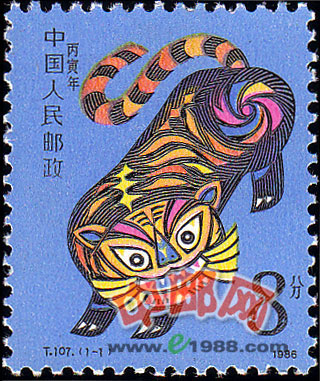 本套邮票共1枚,为“丙寅年”。在设计者笔下,老虎那虎视眈眈的眼睛、强有力的身躯、优美的虎纹都给人以强烈的艺术感受。这只虎威风凛凛、咄咄逼人,同时又显出一丝稚气和憨态。作者采用了民间传统装饰的手法,其图案简洁单纯,概括性强,但又神形兼备。