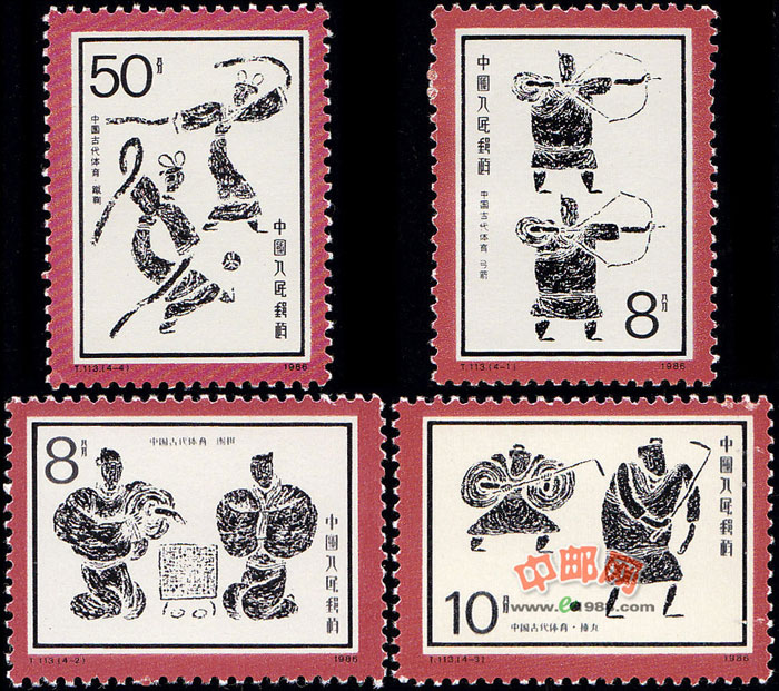 这套邮票的画法吸取了中国古代画像砖拓片艺术,古朴、自然。整个画面的色彩,简单而富有装饰感。人物造型夸张变形,为整套邮票古朴、抒情而富于装饰的意韵定下了一个基调。主体部分单一黑色,模仿汉画石中的阳刻法拓片效果,人物和边框的绘制追求一种古朴的残缺美。使票面具有一种比较强烈的古意,突出了古代的体育的主题。